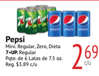 Pepsi Mini. Regular, Zero, Dieta 7UP. Regular PQte. de 6 Latas de 7.5 oz.