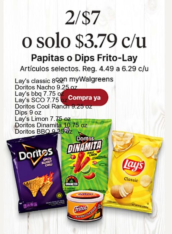 $c/u papitas dips frito-lay artÃculos selectos reg. lay's classic mywalgreens doritos nacho compra cool ranch limon dinamita dorites spicy sweet chili laon fritos
