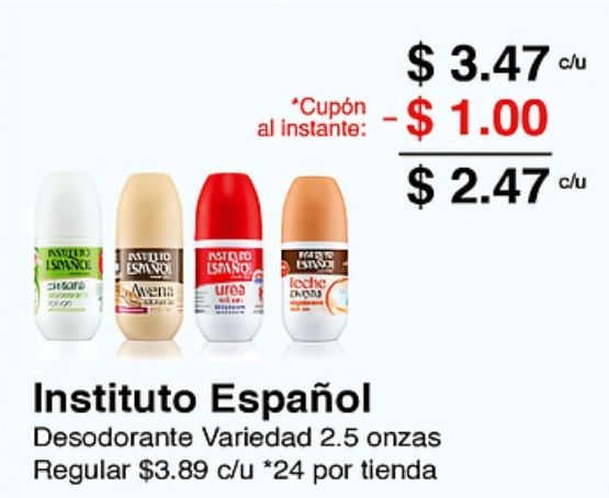*cupón instante: amelo ispanke milio astro espanol espano estvo avena urea leche instituto español desodorante variedad onzas regular $c/u *por tienda
