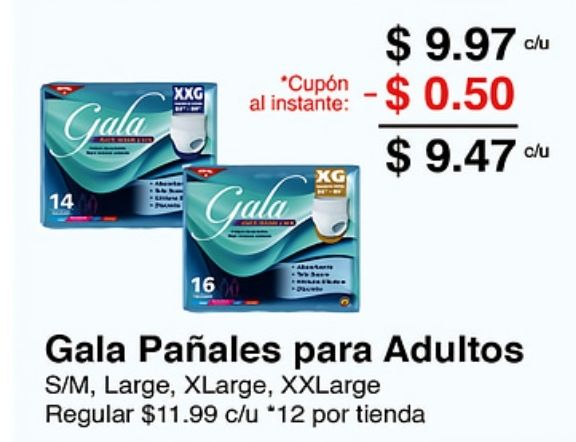 gala *cupón instante: -$ala pañales adultos large, xlarge, xxlarge regular $c/u *por tienda