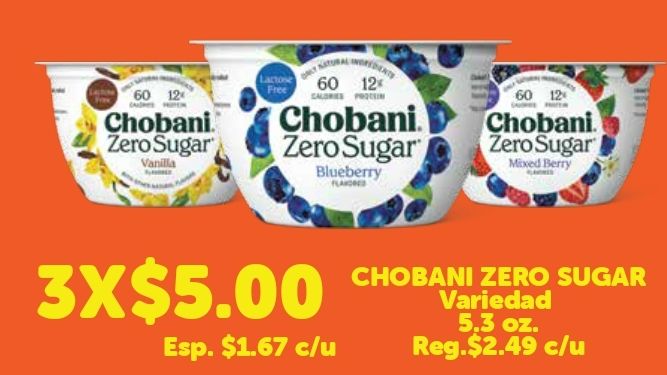 lactose free chobani zero sugar vanilla blueberry mixed berry x$esp. $c/u variedad reg.$c/u
