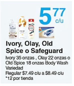 ivory olay, spice safeguard onzas, olay onzas body wash variedad regular $c/u *por tienda