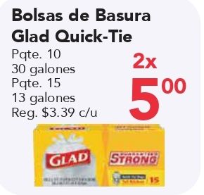 bolsas basura glad quick-tie pqte alones pqte. reg. $c/u strong