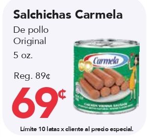 salchichas carmela pollo original reg. lĂmite latas cliente precio especial.
