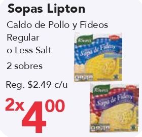 sopas lipton caldo pollo fideos regular less salt sobres $c/u sopa fide
