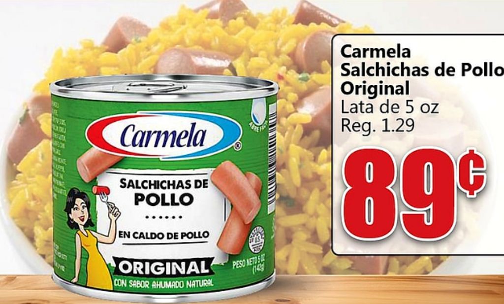 contres carmela salchichas pollo ..... caldo original sabor ahumado natural peso netos lata reg.