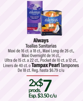 Always Toallas Sanitarias Maxi de 16 ct. a 18 ct., Maxi Long de 26 ct., Maxi Overnight de 14 ct., Ultra de 15 ct. a 22 ct., Pocket de 10 ct. a 12 ct., Liners de 40 ct.