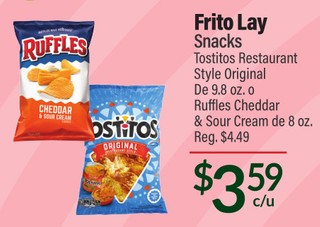 Frito Lay Snacks Tostitos Restaurant Style Original De 9.8 oz. o Ruffles Cheddar & Sour Cream de 8 oz.