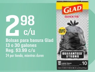 Bolsas para basura Glad 13 o 30 galones.