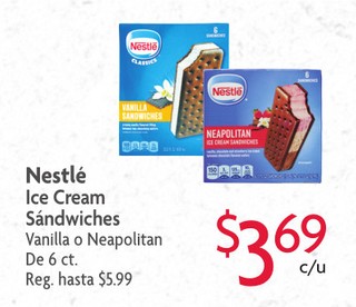 Nestlé Ice Cream Sándwiches Vanilla o Neapolitan De 6 ct.