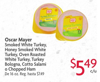 Oscar Mayer Smoked White Turkey, Honey Smoked White Turkey, Oven Roasted White Turkey, Turkey Bologna, Cotto Salami o Chopped Ham De 16 oz.