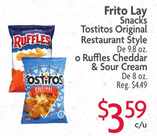 Frito Lay Snacks Tostitos Original Restaurant Style De 9.8 oz. o Ruffles Cheddar & Sour Cream De 8 oz.