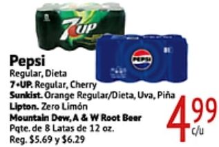 pepsi regular dieta regular, cherry sunkist. orange regular/dieta, uva, piña lipton. zero limón mountain dew, root beer pate. latas reg.