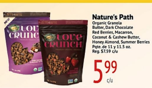 restiante pittabite crunc love crunch nature's path organic granola butter dark chocolate berries, macarron, coconut cashew butter, honey almond, summer berries pqte reg. $c/u