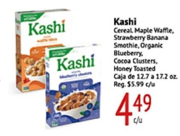 kashi cereal maple waffle strawberry banana smothie, organic blueberry, cocoa clusters, honey toasted caja reg. $c/u