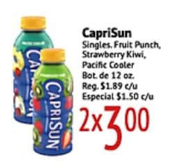 caprisun singles fruit punch strawberry kiwi, pacific cooler reg. $c/u especial xcan