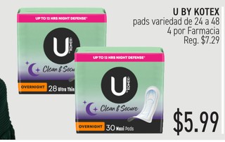 U by Kotex pads variedad de 24 a 48. 4 por farmacia.