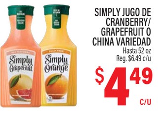 SIMPLY JUGO DE CRANBERRY/GRAPEFRUIT O CHINA VARIEDAD Hasta 52 oz.