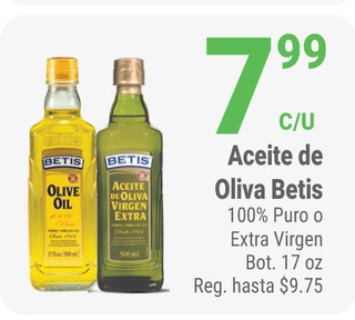 Aceite de Oliva Betis 100% Puro o Extra Virgen Bot. 17 oz.