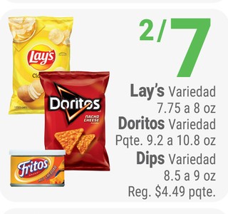 Lay's Variedad 7.75 a 8 oz. Doritos Variedad Pqte. 9.2 a 10.8 Dips Variedad 8.5 a 9 oz.