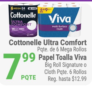 Cottonelle Ultra Comfort Pqte. de 6 Mega Rollos Papel Toalla Viva Big Roll Signature o Cloth Pqte. 6 Rollos