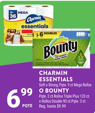 CHARMIN ESSENTIALS Soft o Strong, Pqte. 9 ct Mega Rollos O BOUNTY Pqte. 2 ct Rollos Triple Plus 123 ct. o Rollos Double 90 ct. Pqte. 3 ct