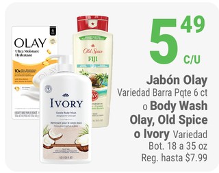 Jabón Olay Variedad Barra Pqte 6 ct Body Wash Olay, Old Spice o Ivory Variedad Bot. 18 a 35 oz.