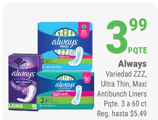 Always Variedad ZZZ, Ultra Thin, Maxi Antibunch Liners Pqte. 3 a 60 ct