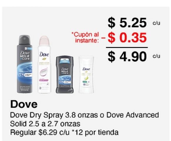 dove care *cupón instante: +care spray onzas advanced solid regular $c/u *por tienda