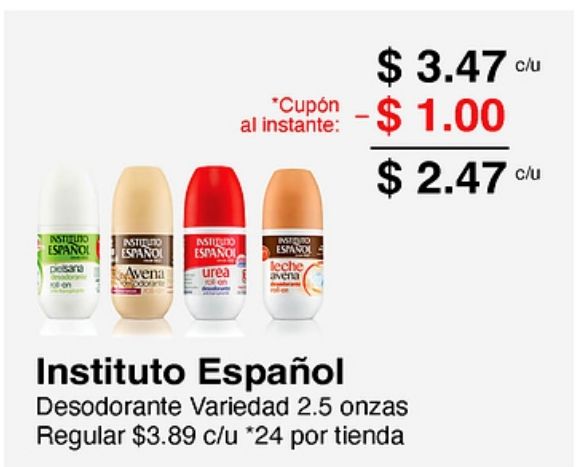 instituto español instituino españo desan avena urea *cupón instante: leche desodorante variedad onzas regular $c/u *por tienda
