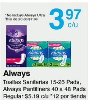 incluye alvvays ultra thin $always always toallas sanitarias pads pantiliners regular $c/u *por tienda