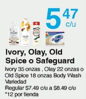 olay ivory olay, spice safeguard onzas, onzas body wash variedad regular $c/u *por tienda