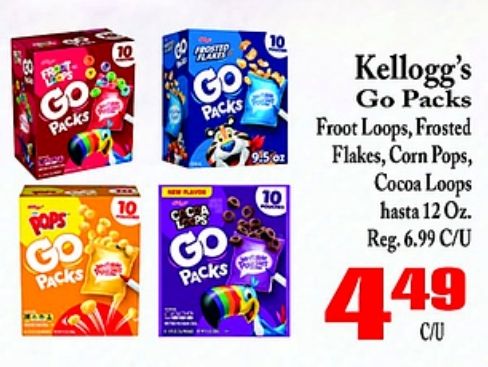 packs pops frosted kellogg's froot loops flakes, corn pops, cocoa reg.