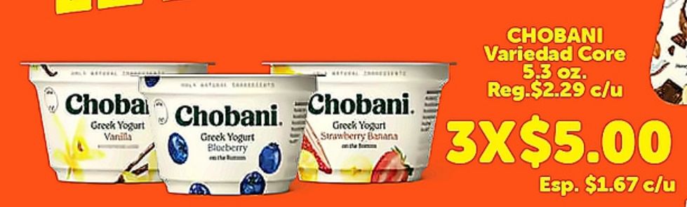 chobani choba chobani. greek yogurt vanilla blueberry strawberry banana variedad core reg.$c/u x$esp. $c/u