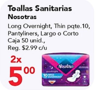 toallas sanitarias long overnight thin pqte, pantyliners, corto caja unid, reg. $c/u