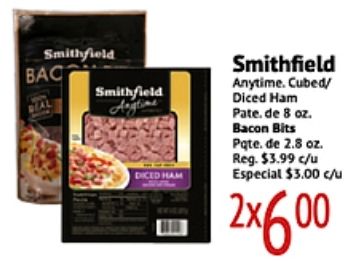 smithfield angline diced anytime cubed/ pate. bacon bits pqte. reg. $c/u especial