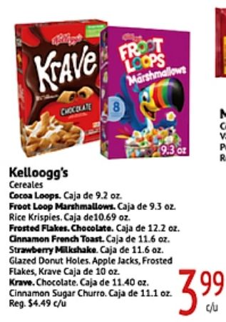 kave chocolate froot loops marshmallows kelloogg's cereales cocoa caja loop marshmallows. rice krispies. frosted flakes. chocolate. cinnamon french toast. strawberry milkshake. glazed donut holes. apple jacks flakes, krave krave. sugar churro. reg. $c/u