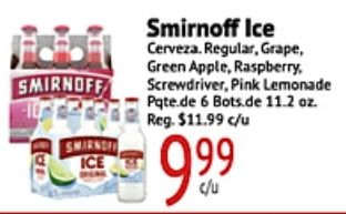 smirnoff cerveza regular grape, green apple, raspberry, screwdriver, pink lemonade pqte.de bots.de reg. $c/u