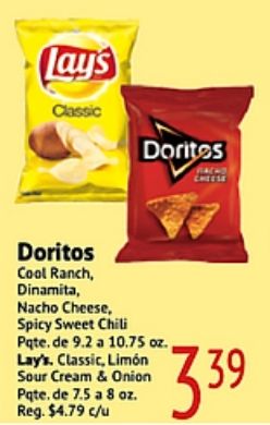 lay's classic dorites doritos cool ranch dinamita, nacho cheese, spicy sweet chili pqte lay's. classic, limón sour cream onion pqte. reg. $c/u