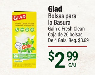 Glad Bolsas para la Basura Gain o Fresh Clean Caja de 26 bolsas De 4 Gals.