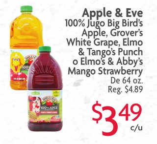 Apple & Eve 100% Jugo Big Bird's Apple, Grover's White Grape, Elmo & Tango's Punch o Elmo's & Abby's Mango Strawberry De 64 oz.