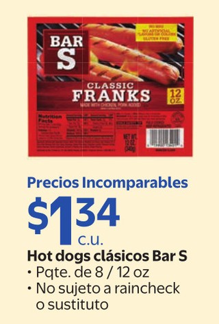 Hot dogs clásicos Bar S Pqte. de 8 / 12 oz